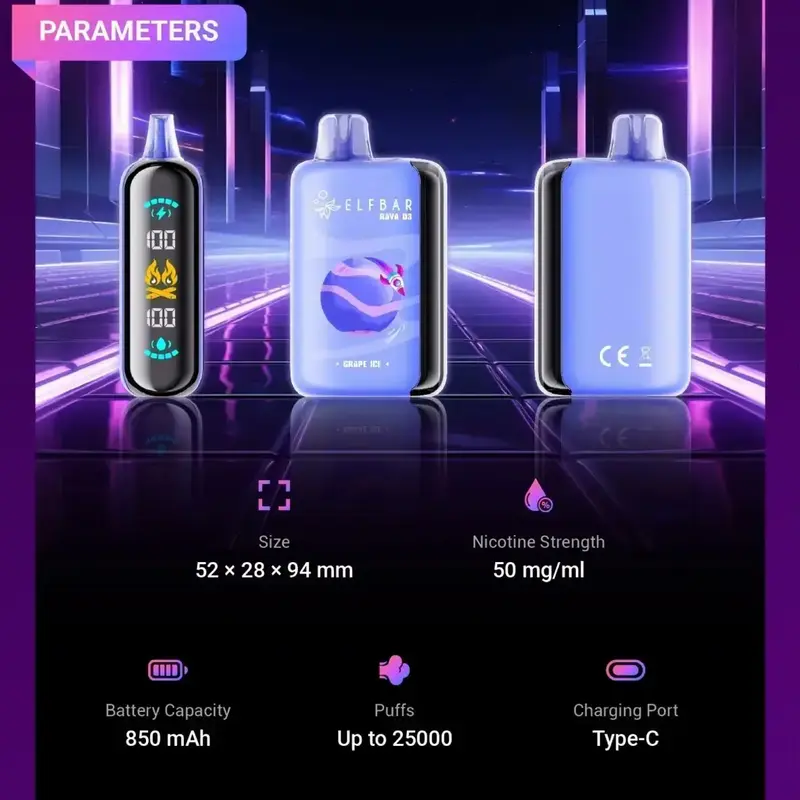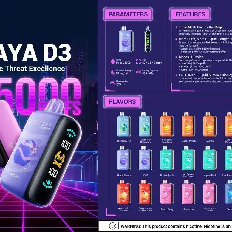 Experience the future of vaping with the ElfBar Raya D3 25000 Puffs Disposable Vape Pod, now available in India. This innovative device offers an unmatched vaping experience with its groundbreaking 25,000 puff capacity and advanced features that set it apart from other disposable vapes in the market. The Elf Bar Raya D3 is equipped with an integrated air and pressure adjustment system, allowing users to customize their vaping experience for maximum satisfaction. Its stylish design features a large digital side screen and a striking monochrome blue outer ring light, blending technology and aesthetics seamlessly. Unmatched Features of Elf Bar Raya D3 Massive Vape Juice Capacity: With a generous 23ml e-liquid capacity, the Elf Bar Raya D3 ensures long-lasting use without frequent refills. Triple Mesh Coil System: Delivering superior flavor and vapor production, ensuring each puff is full of rich, satisfying taste. Variable Puff Settings: Customize your puff count with three modes – 25K, 20K, and 15K – to suit your vaping style. High-Capacity Battery: Powered by an 850mAh battery with Type-C charging, ensuring that your device stays powered up when you need it most. Digital Side Screen: The large digital tube display keeps you informed of your puff count and other vital details at a glance. Airflow and Pressure Customization: Tailor your experience with adjustable airflow and pressure settings for a perfect vaping session every time. Sleek and Stylish Design: The outer ring features a captivating monochrome blue light, adding a touch of elegance to your vaping routine. Extensive Flavor Selection: Choose from 15 delightful flavors, each designed to enhance your vaping experience. Why Choose Elf Bar Raya D3 in India? The Elf Bar Raya D3 25000 Puffs Disposable Vape Pod is perfect for vapers looking for convenience and performance. With three vaping modes—Lite, Smooth, and Turbo—you can effortlessly switch between more puffs or denser clouds depending on your preference. Its durable build and long-lasting battery make it ideal for both casual and heavy vapers in India.
